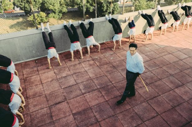オープニングを飾るのは、サモ・ハンの「練功」。屋上でカンフーの訓練を受ける子供たちを描いた作品だ。逆立ち、ブリッジ、宙返り……。
