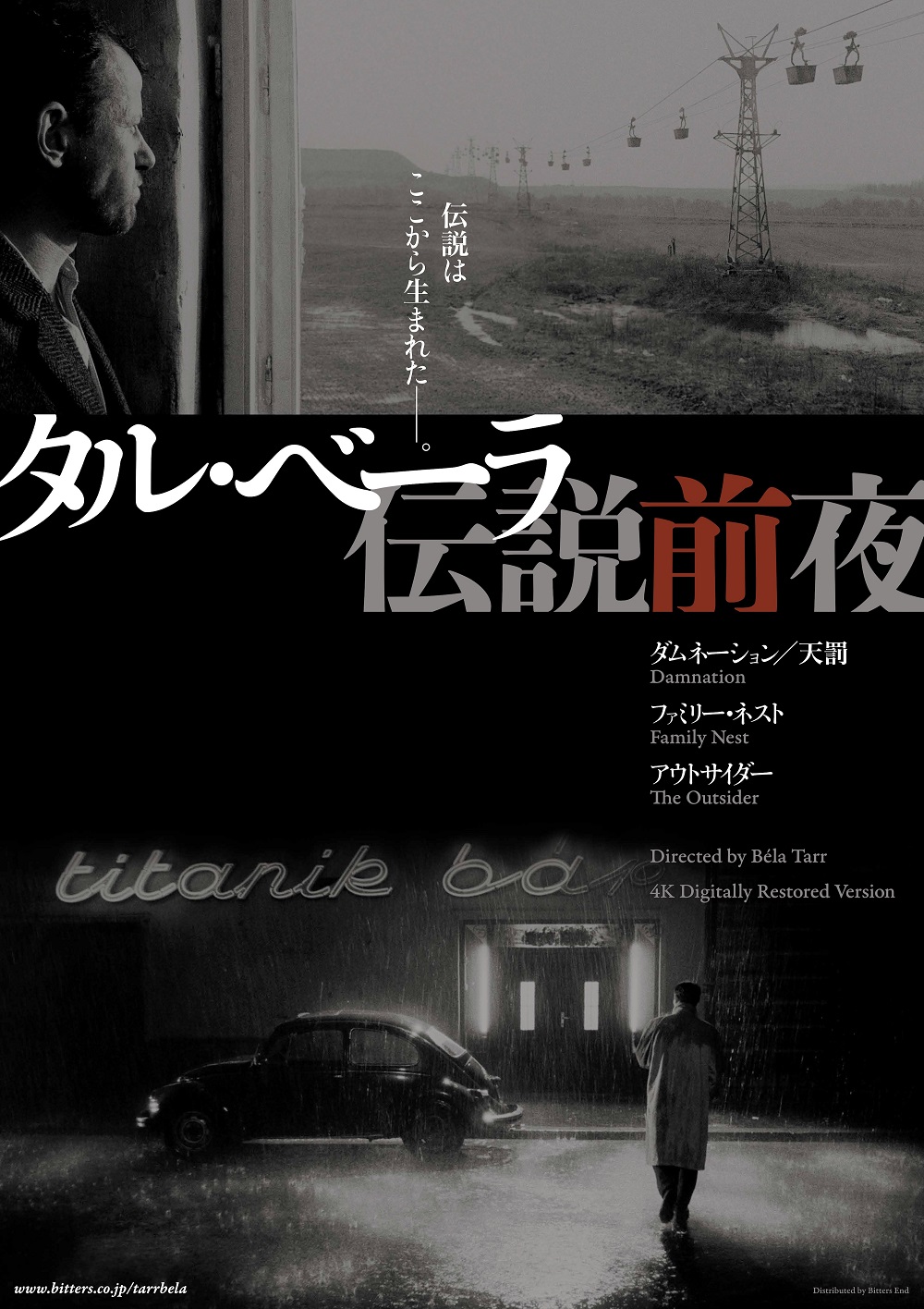 同時上映されるのは、デビュー作「ファミリー・ネスト」(77)および長編第二作「アウトサイダー」(81)。ともにまだタル・ベーラ独自のスタイルは確立していないものの、社会から見捨てられた人々の生活を鮮烈に描き出している点で一貫している。